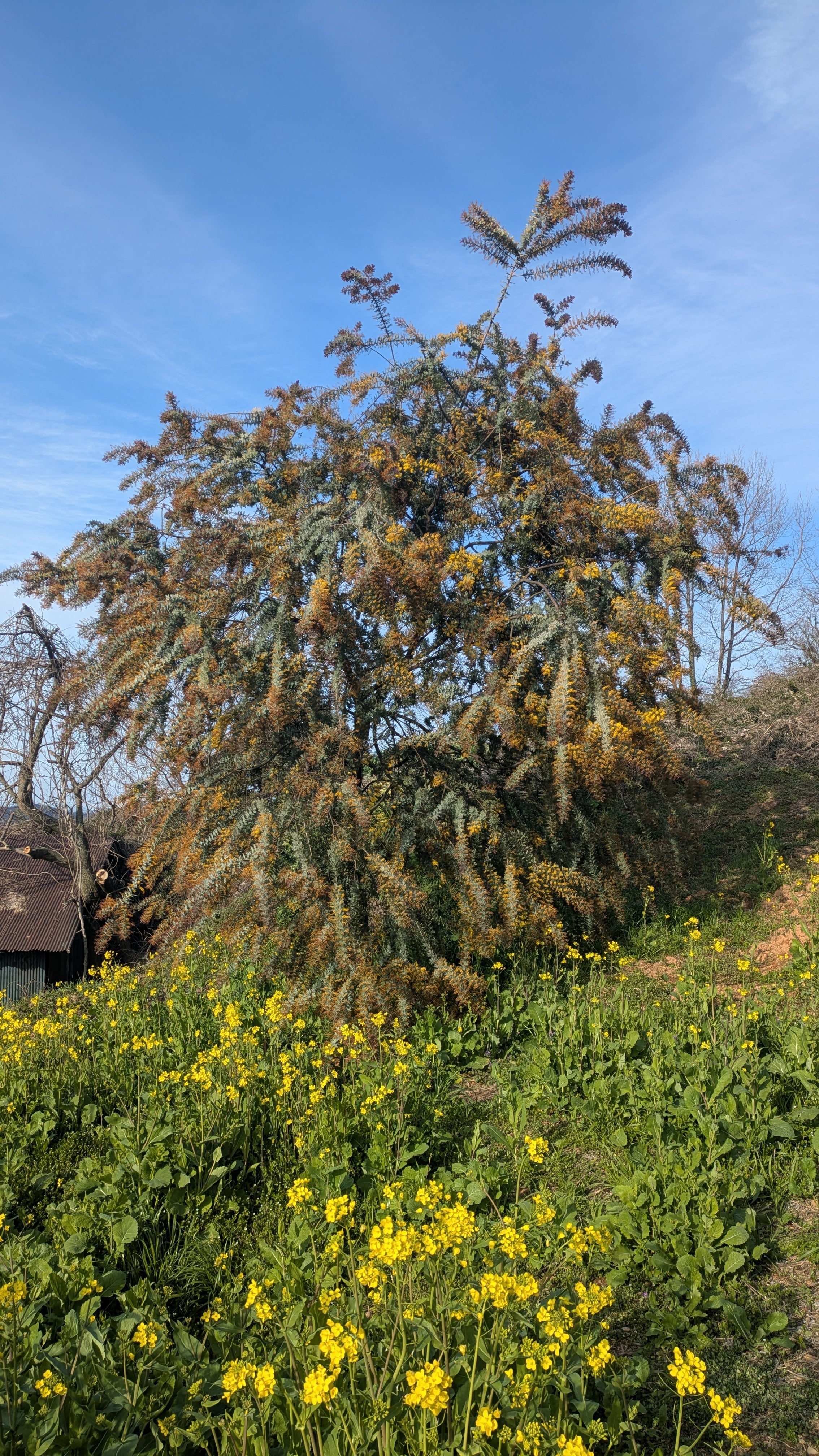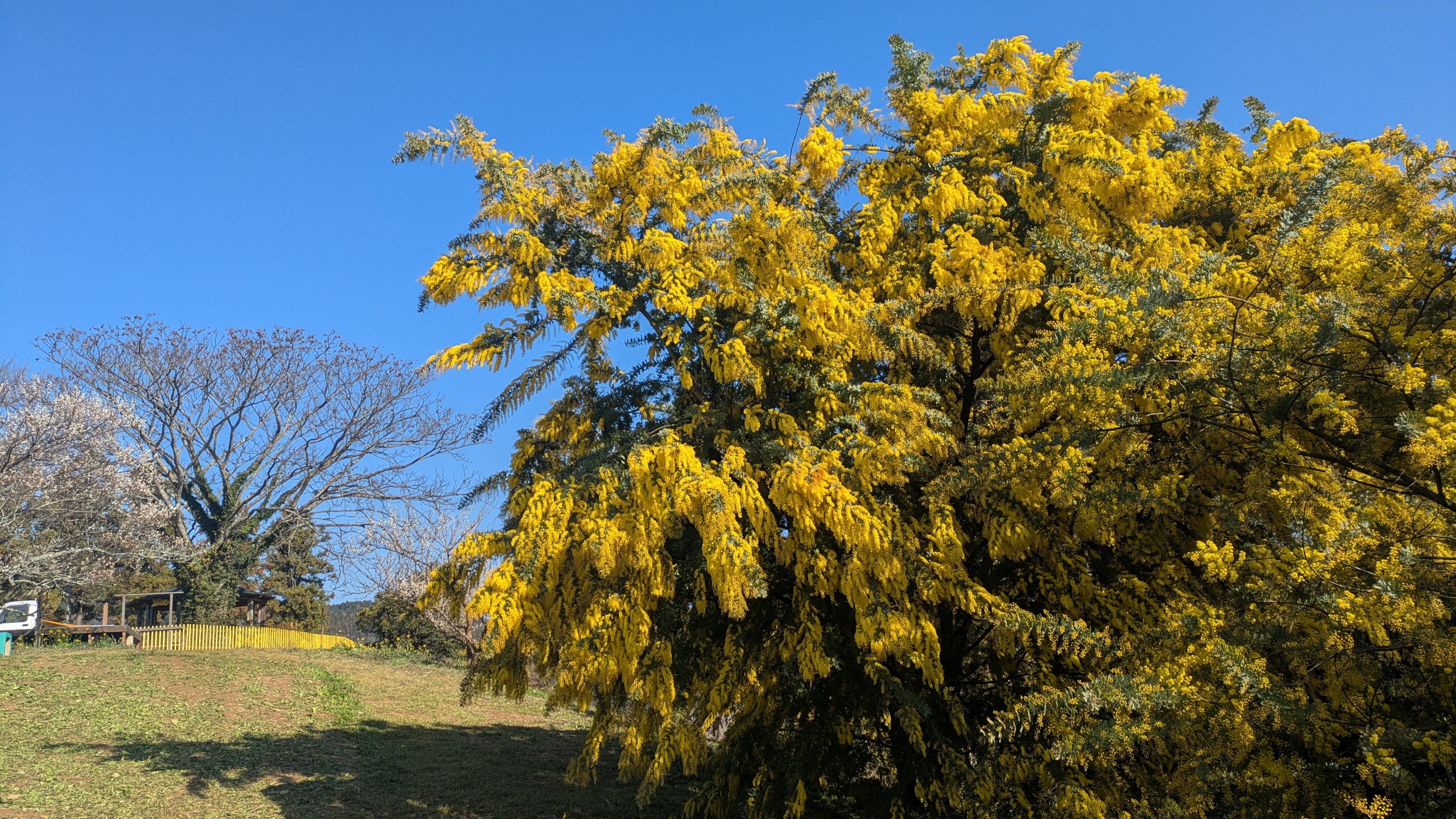 ミモザ アカシア 満開の個体が増えています。丘の頂上に満開の個体があります(写真)